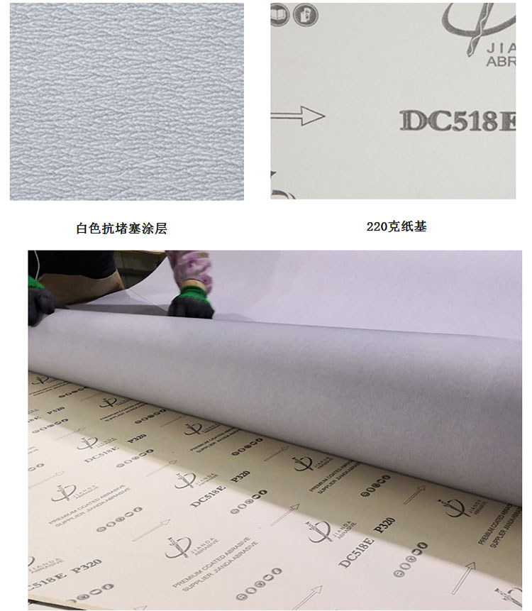 品名:碳化硅磨料白色抗堵塞涂层纸基砂带 型号:DC518E 磨料:碳化硅 基体:220克纸基,E型纸 粒度号:40# 60# 80# 100# 120# 150# 180# 240# 320# 400# 600# 应用:木头,金属行业,打磨家具,木材产品,金属,铜和铝,合成材料等 说明:我公司常备库存为D型纸和E型纸